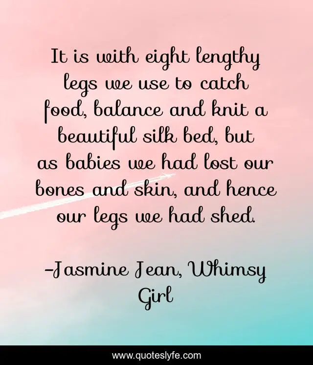 "Jasmine Jean, Whimsy Girl Quotes." Quoteslyfe.com, 2025. Sat. 06 Dec. 2025. <https://www.quoteslyfe.com/quote/It-is-with-eight-lengthy-legs-we-72476>.