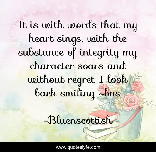 This page presents the quote "It is with words that my heart sings, with the substance of integrity my character soars and without regret I look back smiling ~bns". Author of this quote is Bluenscottish. This quote is about love, character, leadership, bluenscottish, integrity, affection,.