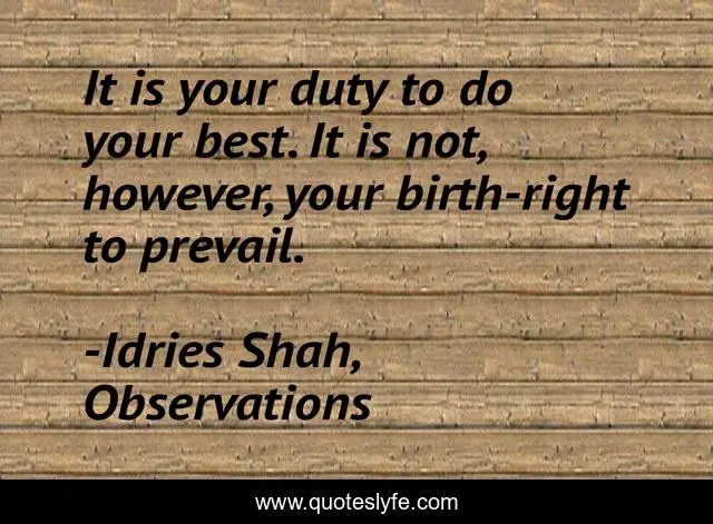 This page presents the quote "It is your duty to do your best. It is not, however, your birth-right to prevail.". Author of this quote is Idries Shah, Observations. This quote is about sufism, sufis, wisdom,.