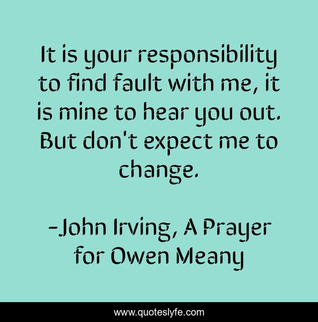 This page presents the quote "It is your responsibility to find fault with me, it is mine to hear you out. But don't expect me to change.". Author of this quote is John Irving, A Prayer for Owen Meany. .