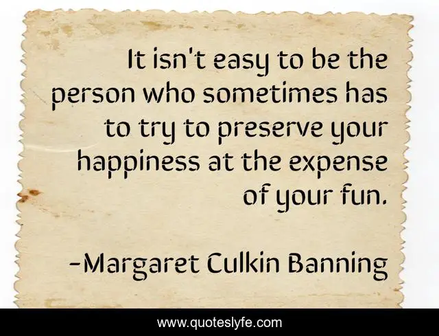 This page presents the quote "It isn't easy to be the person who sometimes has to try to preserve your happiness at the expense of your fun.". Author of this quote is Margaret Culkin Banning. .
