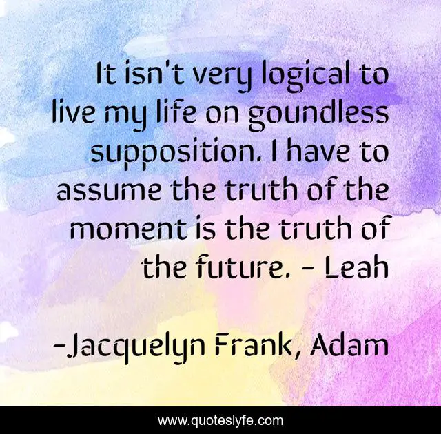 This page presents the quote "It isn't very logical to live my life on goundless supposition. I have to assume the truth of the moment is the truth of the future. - Leah". Author of this quote is Jacquelyn Frank, Adam. This quote is about future, present-moment, logical, supposition,.