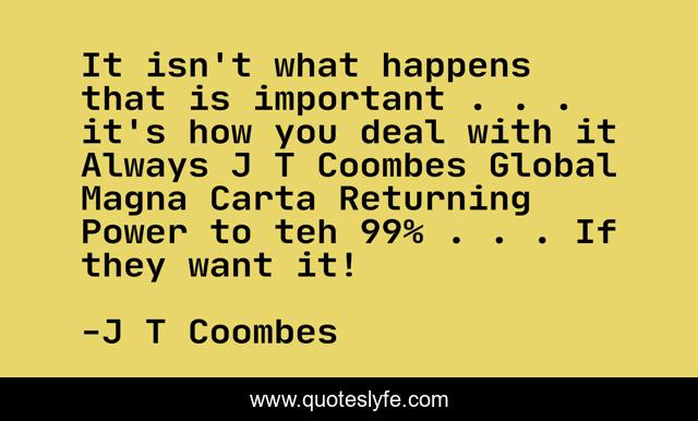 This page presents the quote "It isn't what happens that is important . . . it's how you deal with it Always J T Coombes Global Magna Carta Returning Power to teh 99% . . . If they want it!". Author of this quote is J T Coombes. This quote is about 99, magna-carta, philosophy-of-life,.