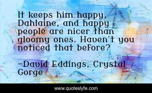 This page presents the quote "It keeps him happy, Dahlaine, and happy people are nicer than gloomy ones. Haven't you noticed that before?". Author of this quote is David Eddings, Crystal Gorge. This quote is about harmless, gloomy, happiness, humour, happy,.