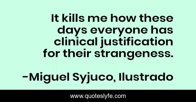 This page presents the quote "It kills me how these days everyone has clinical justification for their strangeness.". Author of this quote is Miguel Syjuco, Ilustrado. This quote is about individuality, life,.