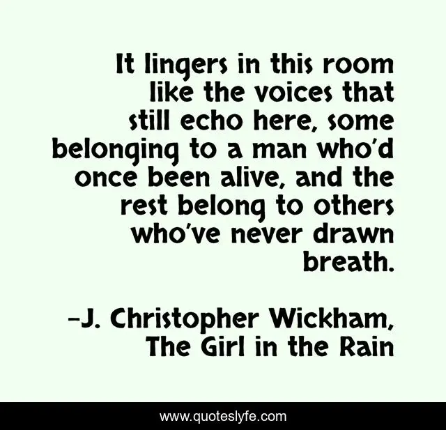This page presents the quote "It lingers in this room like the voices that still echo here, some belonging to a man who’d once been alive, and the rest belong to others who’ve never drawn breath.". Author of this quote is J. Christopher Wickham, The Girl in the Rain. .