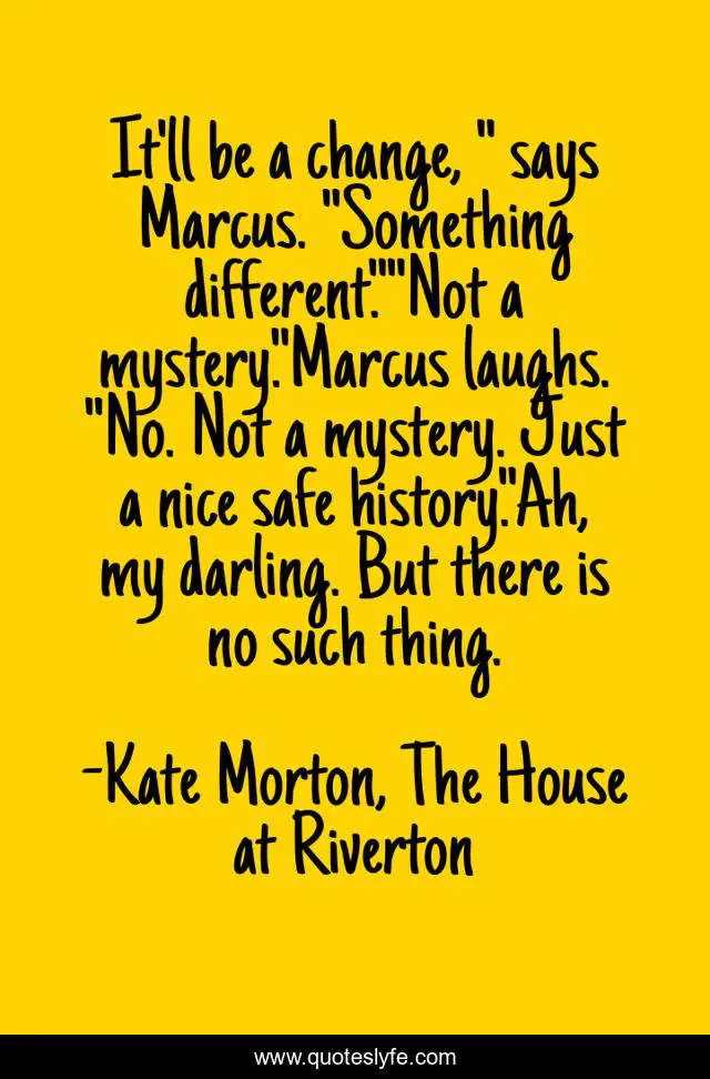This page presents the quote "It'll be a change, " says Marcus. "Something different.""Not a mystery."Marcus laughs. "No. Not a mystery. Just a nice safe history."Ah, my darling. But there is no such thing.". Author of this quote is Kate Morton, The House at Riverton. This quote is about mystery, authors, history, writing,.