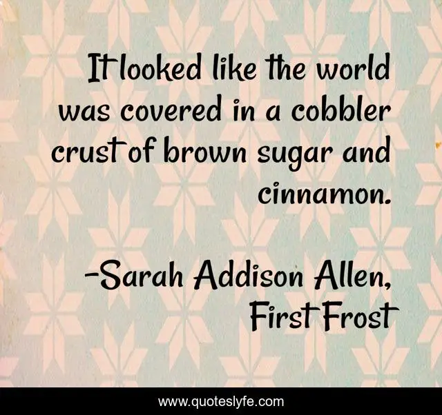 This page presents the quote "It looked like the world was covered in a cobbler crust of brown sugar and cinnamon.". Author of this quote is Sarah Addison Allen, First Frost. This quote is about autumn, first-frost, baking, fall,.