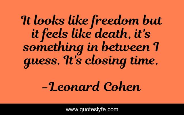 This page presents the quote "It looks like freedom but it feels like death, it's something in between I guess. It's closing time.". Author of this quote is Leonard Cohen. This quote is about denial, end-of-the-party, excess,.