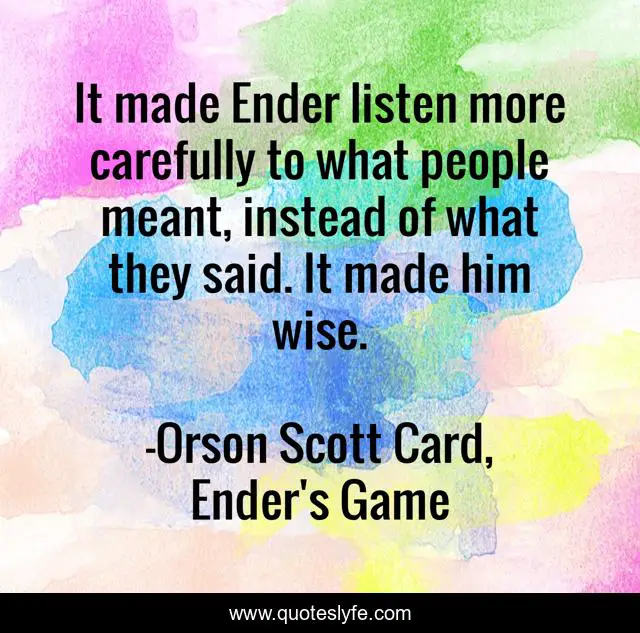 This page presents the quote "It made Ender listen more carefully to what people meant, instead of what they said. It made him wise.". Author of this quote is Orson Scott Card, Ender's Game. This quote is about listen, wise, wisdom,.