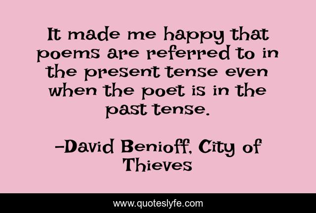 This page presents the quote "It made me happy that poems are referred to in the present tense even when the poet is in the past tense.". Author of this quote is David Benioff, City of Thieves. This quote is about poet, poems, city-of-thieves, poetry,.