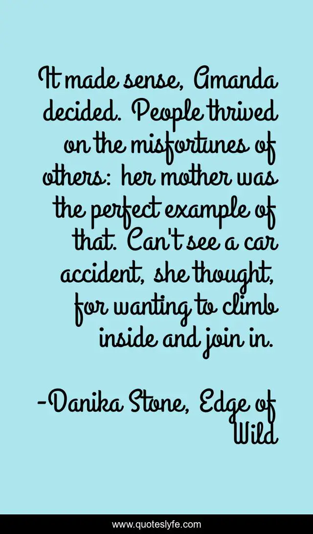 This page presents the quote "It made sense, Amanda decided. People thrived on the misfortunes of others: her mother was the perfect example of that. Can't see a car accident, she thought, for wanting to climb inside and join in.". Author of this quote is Danika Stone, Edge of Wild. This quote is about angst, drama, life-philosophy,.