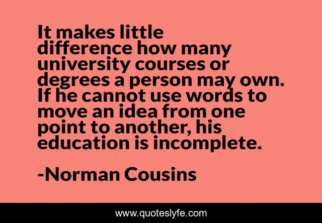 This page presents the quote "It makes little difference how many university courses or degrees a person may own. If he cannot use words to move an idea from one point to another, his education is incomplete.". Author of this quote is Norman Cousins. This quote is about education, idea, words,.