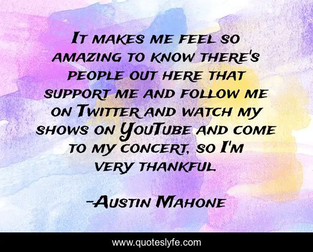 This page presents the quote "It makes me feel so amazing to know there's people out here that support me and follow me on Twitter and watch my shows on YouTube and come to my concert, so I'm very thankful.". Author of this quote is Austin Mahone. This quote is about me, support, amazing,.
