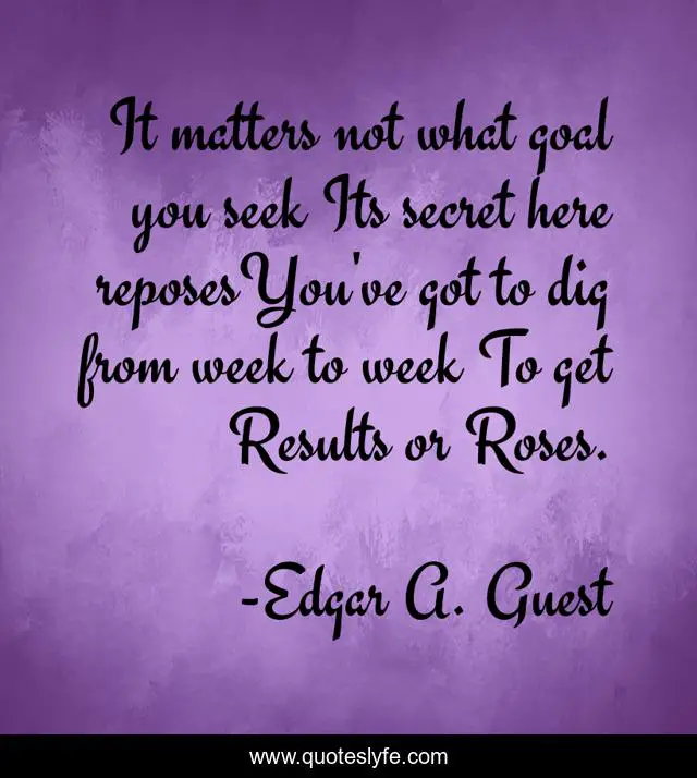 This page presents the quote "It matters not what goal you seek Its secret here reposesYou've got to dig from week to week To get Results or Roses.". Author of this quote is Edgar A. Guest. This quote is about goals, results,.