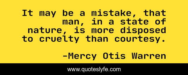 This page presents the quote "It may be a mistake, that man, in a state of nature, is more disposed to cruelty than courtesy.". Author of this quote is Mercy Otis Warren. This quote is about courtesy, man, mistake,.