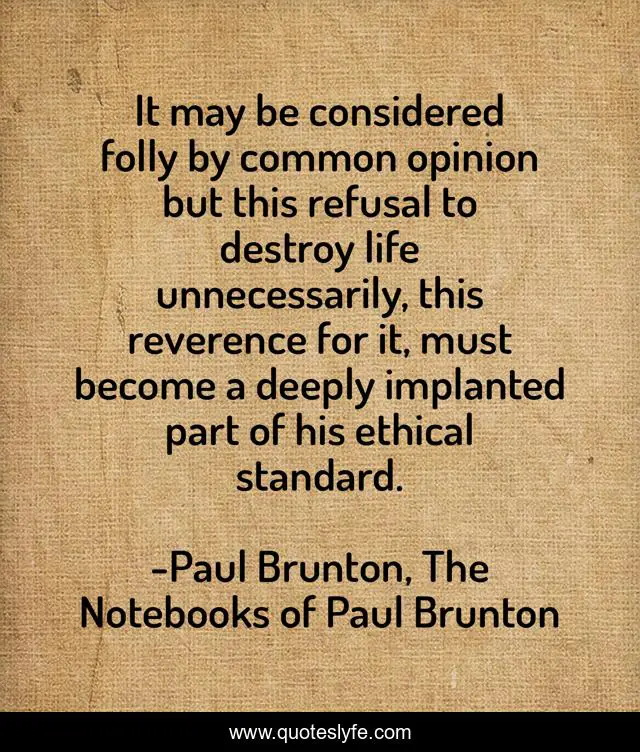 This page presents the quote "It may be considered folly by common opinion but this refusal to destroy life unnecessarily, this reverence for it, must become a deeply implanted part of his ethical standard.". Author of this quote is Paul Brunton, The Notebooks of Paul Brunton. This quote is about vegetarianism, nonviolence, ethics,.