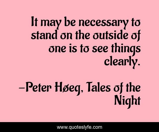 This page presents the quote "It may be necessary to stand on the outside of one is to see things clearly.". Author of this quote is Peter Høeg, Tales of the Night. This quote is about distance, insight, understanding, detachment, clarity, outsiders,.