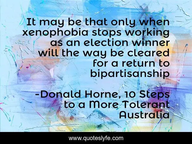 This page presents the quote "It may be that only when xenophobia stops working as an election winner will the way be cleared for a return to bipartisanship". Author of this quote is Donald Horne, 10 Steps to a More Tolerant Australia. This quote is about bipartisan, election, democracy, xenophobia,.