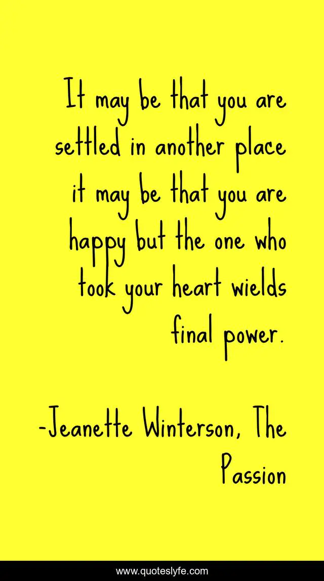 This page presents the quote "It may be that you are settled in another place it may be that you are happy but the one who took your heart wields final power.". Author of this quote is Jeanette Winterson, The Passion. This quote is about passion, obsession, affection, love,.