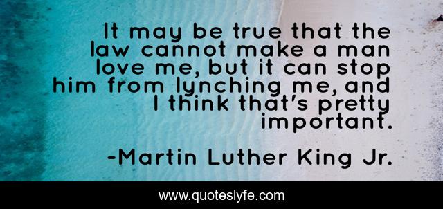 This page presents the quote "It may be true that the law cannot make a man love me, but it can stop him from lynching me, and I think that's pretty important.". Author of this quote is Martin Luther King Jr.. This quote is about life, law, lynchings,.