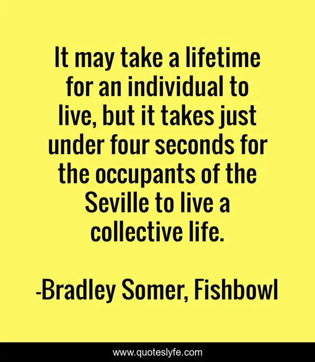 This page presents the quote "It may take a lifetime for an individual to live, but it takes just under four seconds for the occupants of the Seville to live a collective life.". Author of this quote is Bradley Somer, Fishbowl. This quote is about serendipity, philosophy-of-life,.