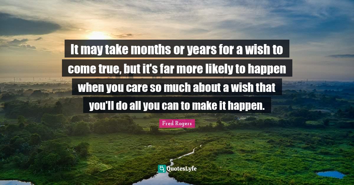 This page presents the quote "It may take months or years for a wish to come true, but it's far more likely to happen when you care so much about a wish that you'll do all you can to make it happen.". Author of this quote is Fred Rogers. This quote is about make it happen, wish, months, may, care, years,.