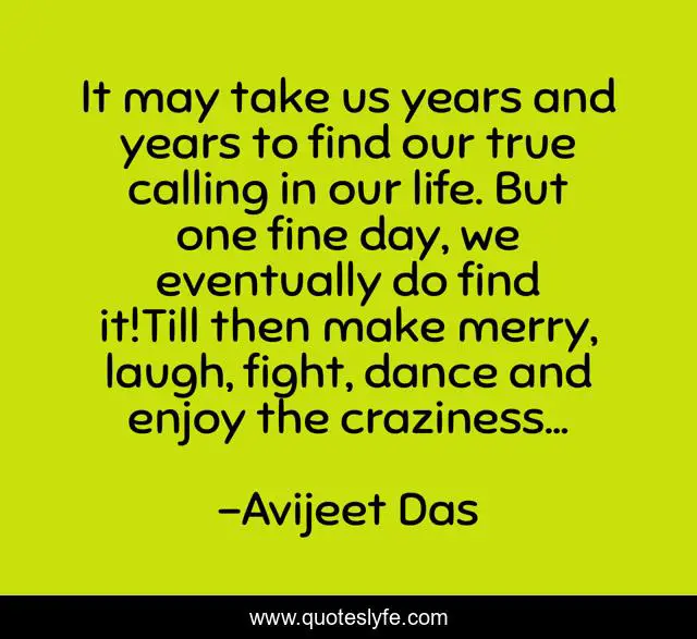 This page presents the quote "It may take us years and years to find our true calling in our life. But one fine day, we eventually do find it!Till then make merry, laugh, fight, dance and enjoy the craziness...". Author of this quote is Avijeet Das. This quote is about life, craziness, dance, fight, laugh, true-calling,.