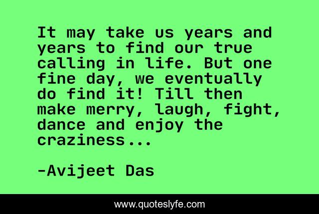 This page presents the quote "It may take us years and years to find our true calling in life. But one fine day, we eventually do find it! Till then make merry, laugh, fight, dance and enjoy the craziness...". Author of this quote is Avijeet Das. This quote is about artiste, crazy, love, craziness, dance, life, fight, passion, find-it,.