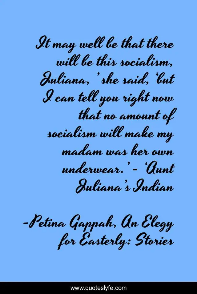 This page presents the quote "It may well be that there will be this socialism, Juliana, ’ she said, ‘but I can tell you right now that no amount of socialism will make my madam was her own underwear.’ - ‘Aunt Juliana’s Indian". Author of this quote is Petina Gappah, An Elegy for Easterly: Stories. This quote is about short-stories, zimbabwe, socialism, petina-gappah,.