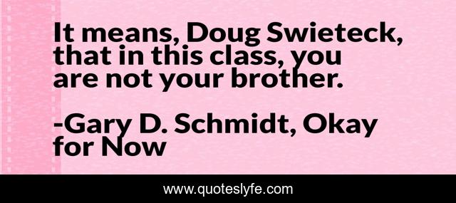 This page presents the quote "It means, Doug Swieteck, that in this class, you are not your brother.". Author of this quote is Gary D. Schmidt, Okay for Now. .