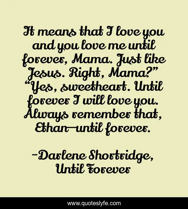 This page presents the quote "It means that I love you and you love me until forever, Mama. Just like Jesus. Right, Mama?” “Yes, sweetheart. Until forever I will love you. Always remember that, Ethan—until forever.". Author of this quote is Darlene Shortridge, Until Forever. This quote is about until-forever, christian, jesus, ethan, love, affection,.