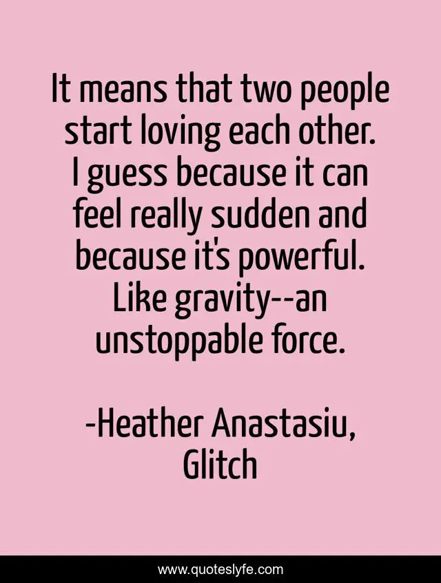 This page presents the quote "It means that two people start loving each other. I guess because it can feel really sudden and because it's powerful. Like gravity--an unstoppable force.". Author of this quote is Heather Anastasiu, Glitch. This quote is about falling-in-love, love, being-in-love, fall-in-love, in-love, affection,.