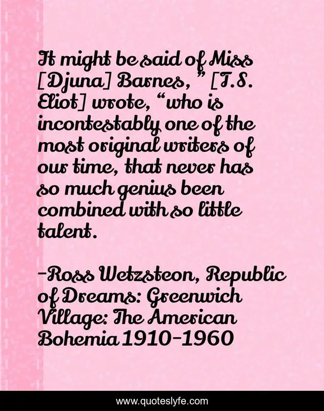 This page presents the quote "It might be said of Miss [Djuna] Barnes, ” [T.S. Eliot] wrote, “who is incontestably one of the most original writers of our time, that never has so much genius been combined with so little talent.". Author of this quote is Ross Wetzsteon, Republic of Dreams: Greenwich Village: The American Bohemia 1910-1960. This quote is about genius, tseliot, djunabarnes, talent, writing,.