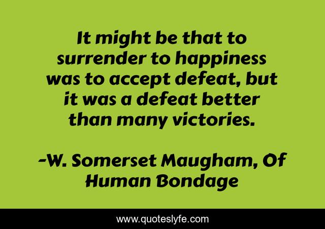 This page presents the quote "It might be that to surrender to happiness was to accept defeat, but it was a defeat better than many victories.". Author of this quote is W. Somerset Maugham, Of Human Bondage. This quote is about dreams, happiness, victory,.