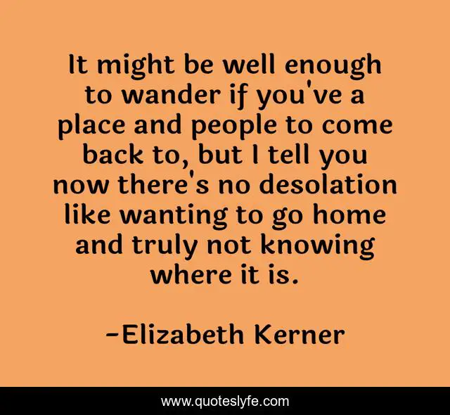 This page presents the quote "It might be well enough to wander if you've a place and people to come back to, but I tell you now there's no desolation like wanting to go home and truly not knowing where it is.". Author of this quote is Elizabeth Kerner. This quote is about home, jamie, wandering, wanderlust,.
