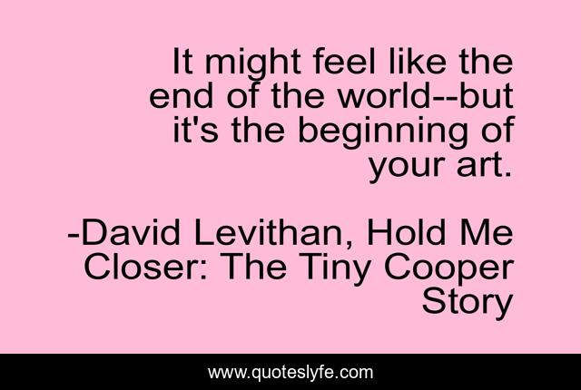 This page presents the quote "It might feel like the end of the world--but it's the beginning of your art.". Author of this quote is David Levithan, Hold Me Closer: The Tiny Cooper Story. This quote is about art, lyrics, love, musical, affection,.