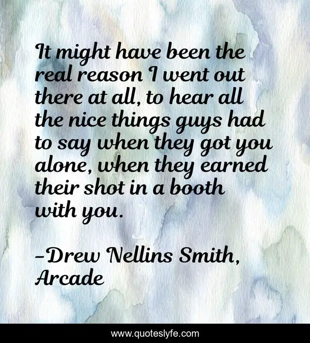 This page presents the quote "It might have been the real reason I went out there at all, to hear all the nice things guys had to say when they got you alone, when they earned their shot in a booth with you.". Author of this quote is Drew Nellins Smith, Arcade. This quote is about reason, booth, nice,.