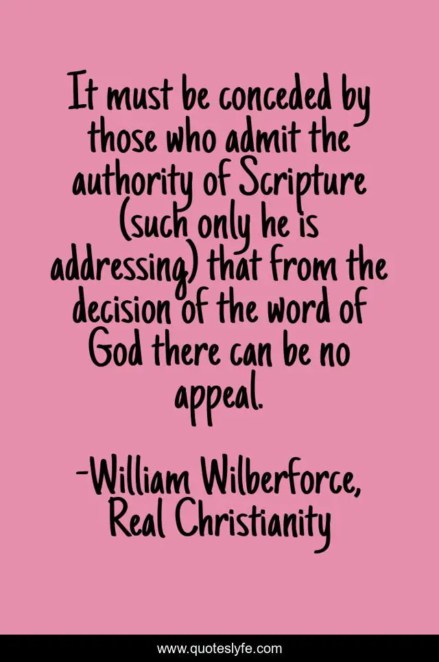 This page presents the quote "It must be conceded by those who admit the authority of Scripture (such only he is addressing) that from the decision of the word of God there can be no appeal.". Author of this quote is William Wilberforce, Real Christianity. This quote is about bible, christianity,.