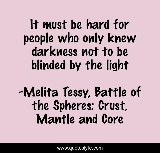 This page presents the quote "It must be hard for people who only knew darkness not to be blinded by the light". Author of this quote is Melita Tessy, Battle of the Spheres: Crust, Mantle and Core. This quote is about blindness, light-and-darkness, vision,.