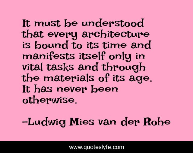 This page presents the quote "It must be understood that every architecture is bound to its time and manifests itself only in vital tasks and through the materials of its age. It has never been otherwise.". Author of this quote is Ludwig Mies van der Rohe. This quote is about age, through, time,.
