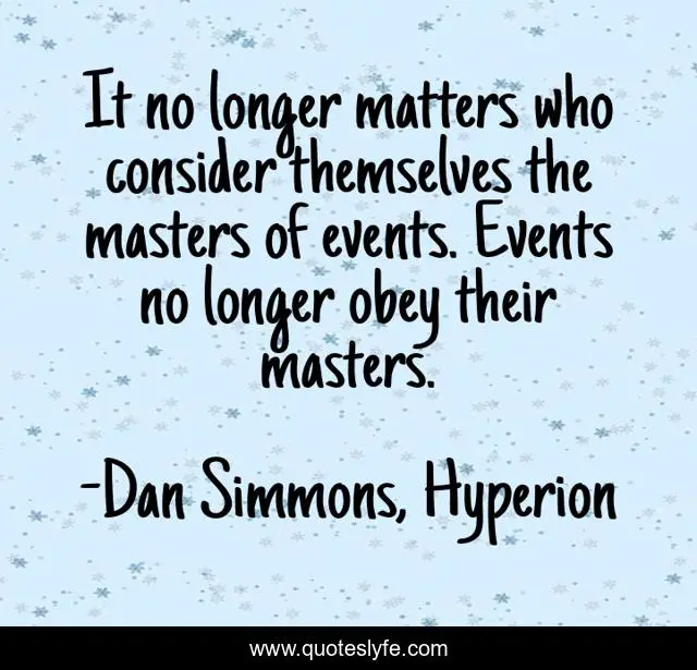 This page presents the quote "It no longer matters who consider themselves the masters of events. Events no longer obey their masters.". Author of this quote is Dan Simmons, Hyperion. This quote is about obeying, masters, puppeteers,.