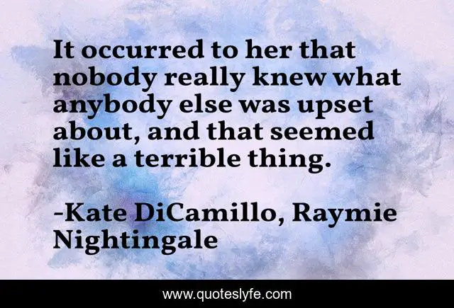 This page presents the quote "It occurred to her that nobody really knew what anybody else was upset about, and that seemed like a terrible thing.". Author of this quote is Kate DiCamillo, Raymie Nightingale. This quote is about empathy, growing-up,.