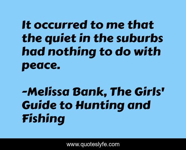 This page presents the quote "It occurred to me that the quiet in the suburbs had nothing to do with peace.". Author of this quote is Melissa Bank, The Girls' Guide to Hunting and Fishing. This quote is about suburbs, peace,.