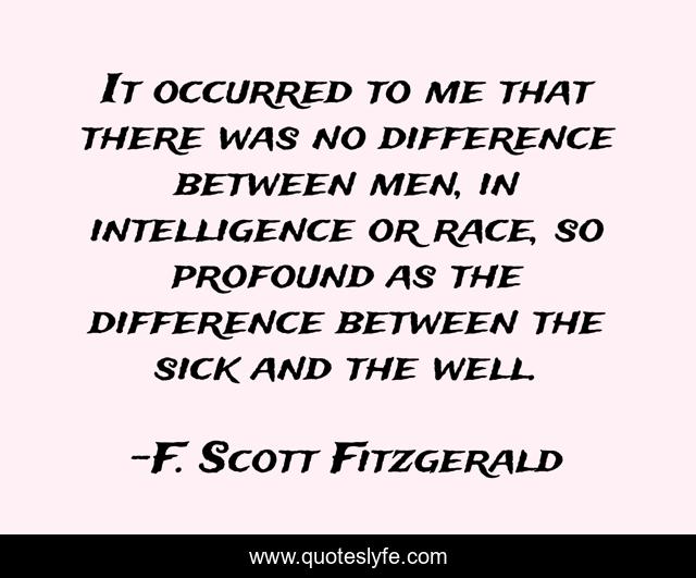 This page presents the quote "It occurred to me that there was no difference between men, in intelligence or race, so profound as the difference between the sick and the well.". Author of this quote is F. Scott Fitzgerald. This quote is about me, men, profound,.