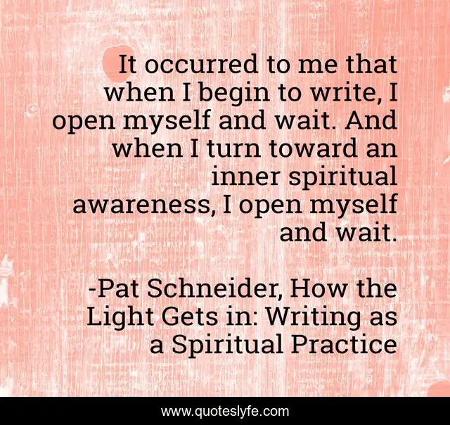 This page presents the quote "It occurred to me that when I begin to write, I open myself and wait. And when I turn toward an inner spiritual awareness, I open myself and wait.". Author of this quote is Pat Schneider, How the Light Gets in: Writing as a Spiritual Practice. .
