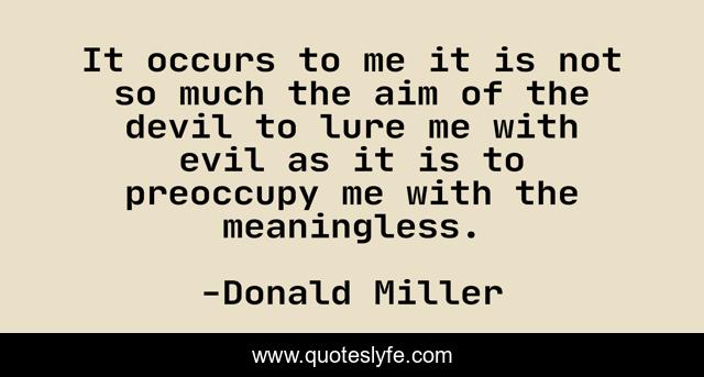 This page presents the quote "It occurs to me it is not so much the aim of the devil to lure me with evil as it is to preoccupy me with the meaningless.". Author of this quote is Donald Miller. .