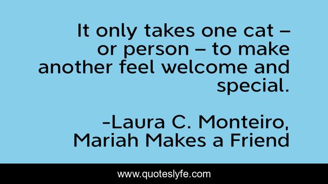 This page presents the quote "It only takes one cat – or person – to make another feel welcome and special.". Author of this quote is Laura C. Monteiro, Mariah Makes a Friend. This quote is about welcome, friendship,.