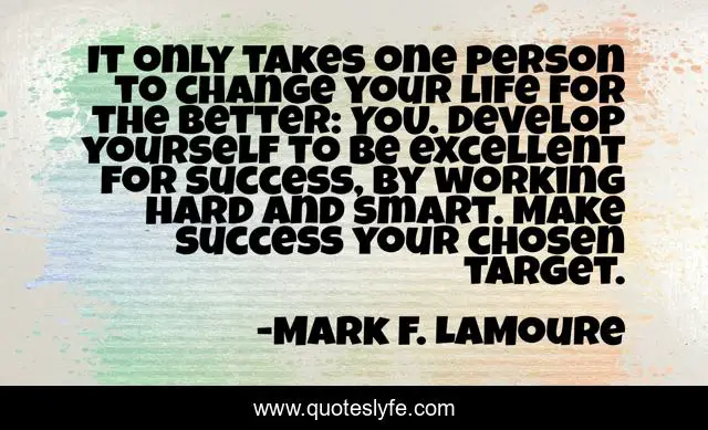 This page presents the quote "It only takes one person to change your life for the better: YOU. Develop yourself to be excellent for success, by working hard and smart. Make success your chosen target.". Author of this quote is Mark F. LaMoure. This quote is about exceptional-people, high-caliber, high-quality, success, positive, excellent-people, excellent, confidence, excellence,.
