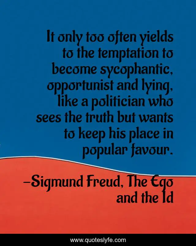 This page presents the quote "It only too often yields to the temptation to become sycophantic, opportunist and lying, like a politician who sees the truth but wants to keep his place in popular favour.". Author of this quote is Sigmund Freud, The Ego and the Id. .